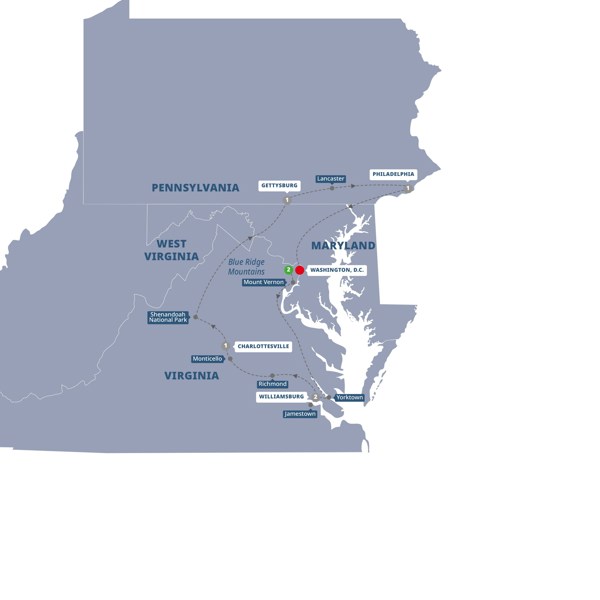Gain insights into the history of the U.S. Constitution and the effect it has had around the world during this morning’s tour through Philadelphia. We’ll explore the UNESCO-listed Independence National Historic Park and see its famous cracked bell whose inscription has inspired so many to “proclaim liberty”. The final stop on your journey is Washington, D.C., where you'll be transferred to either Dulles International Airport or Ronald Reagan National Airport (the journey between the two airports takes approximately 60 minutes) or to the Washington Marriott Georgetown for guests extending their stay.